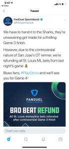 For everyone who took the St. Louis Blues over the San Jose Sharks in game 3, good news, you get your money back. If you fell victim to the controversial hand pass goal, FanDuel is making it whole. That’s a hell of a move for FanDuel and an odd one at that. Will this be the new standard? If the refs clearly botch a call in any sport, will the gambler always get their money back? Here’s the tweet put out by FanDuel announcing there decision…