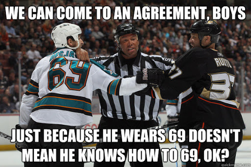 A couple weeks ago we talked about the beer leaguer who went Jimmy SuperFly Snuka into the bench to get his stick back. Admirable move. What myself and many of our followers noticed was the fact that the other team had about a dozen players wearing 69 and that had me thinking- Has an NHL player ever worn 69? And then I did some research, aka I did a quick google search, which lead me to the ol’ hockey reference and this is what we got.