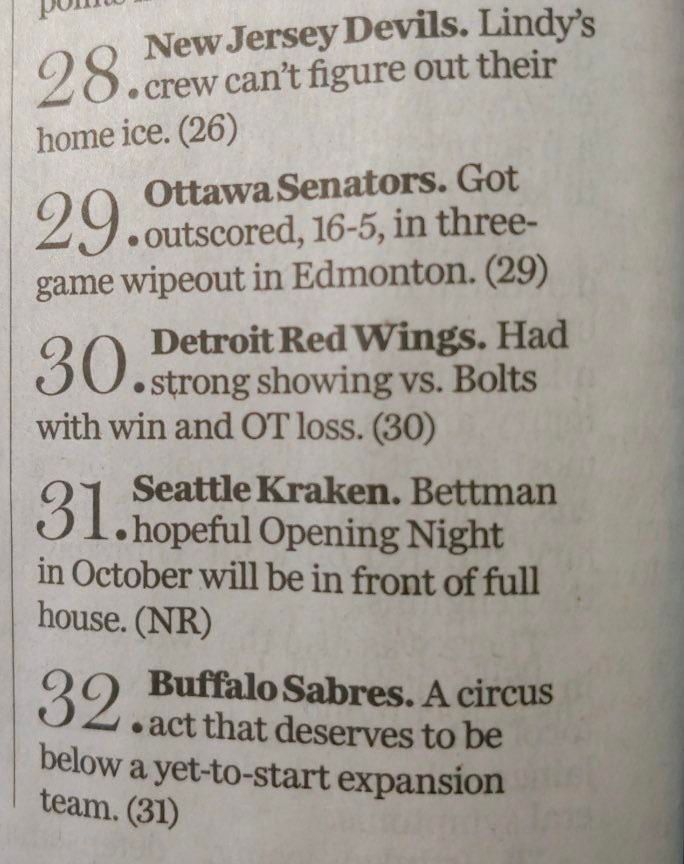 The Bruins played their first game of the year against the woeful Buffalo Sabres resulting in an uneventful 4-1 win. As I see it, the objectives tonight were to secure the 2 points, don’t develop any bad habits and try not to burn themselves playing the NHL’s dumpster fire team. They managed to (mostly) accomplish their goals, but if they weren’t playing an AHL team tonight the results may have been different. When the hometown paper ranks a team that doesn’t even exist yet higher than your squad; that’s not good.