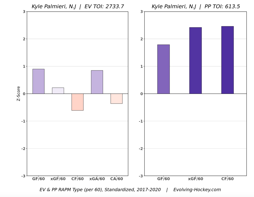 From the 15-16 season onwards, Palmieri’s goal-scoring per year has been 30, 26, 24 in 62 games, 27 in 74 games, and 25 in 65 last year. Seems good! He’s got quick hands and can move pretty well, most importantly though he knows how to finish off a nice pass, unlike some people on the Leafs’ second line… Sorry Kerf. Palmieri is lethal on the power play, 13th in power-play goals in the NHL over the last 5 years, and has even started to play the PK this year. You could play him with Nylander and Tavares or throw him on the third line if you want to add a legitimate goal threat on that line.