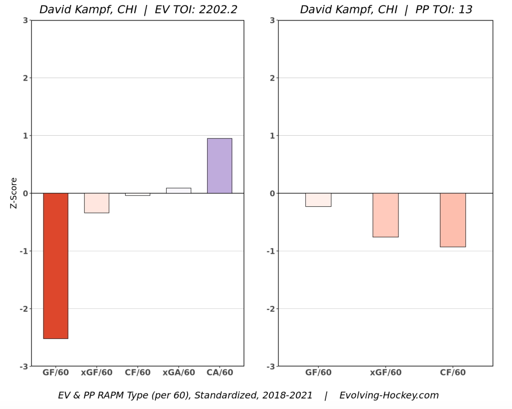 Kampf is a different type of player entirely but still should prove useful. The signing made many Leaf fans scratch their heads when it was announced, but after watching him in the early goings here, it’s becoming clear what his role will be. He’s a defensive centre whose job is to make sure that nothing happens when he is on the ice, and that’s pretty much what he’s done his whole career. Here’s his three year chart.