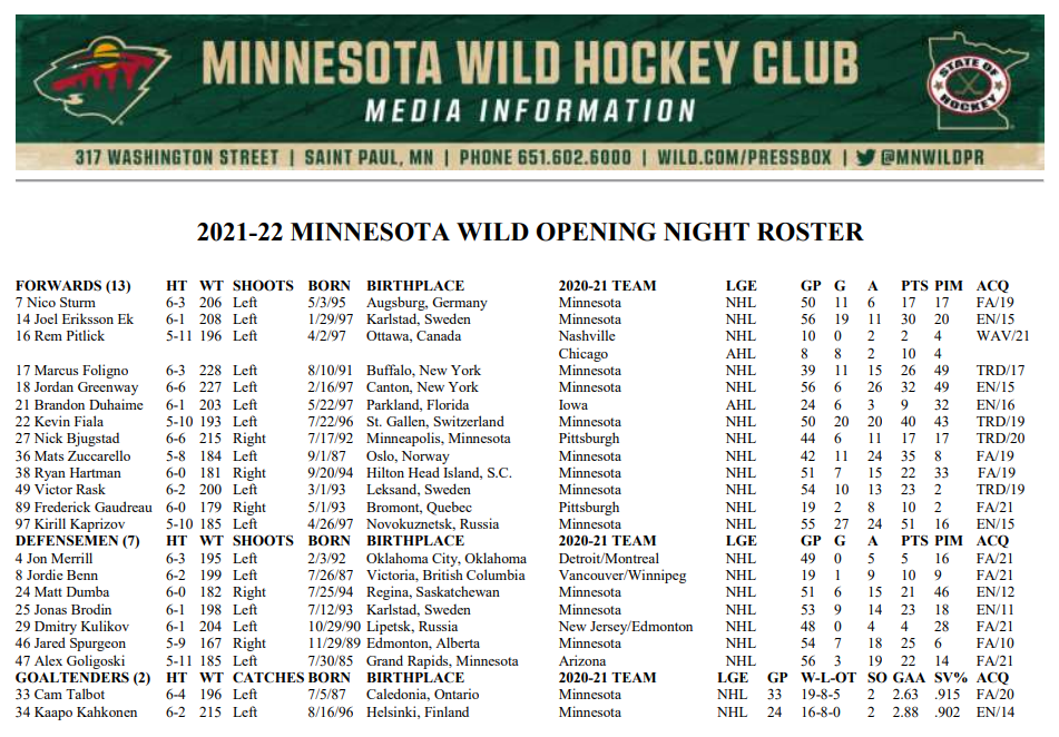 The Wild have a much different, yet relatively solid roster this year, as you can see below. They looked decent last night, though they obviously have areas in which they could improve, such as the power play. They did score on one PP, so it’s not like they were shut out and they did have some good shots 5-on-5 and on the PP, so overall, not too shabby for a season opener.