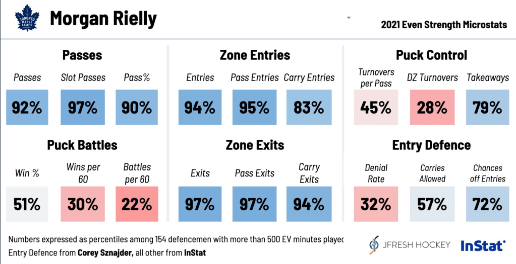 If you’ve paid any attention to the Leafs or Morgan Rielly the last nine seasons, you’ll know by now that Rielly is one of the very best offensive defencemen in the league. Since the start of the 2016/17 season, he ranks fifth in the NHL amongst defensemen in even-strength points per 60, and his ability to drive play is undeniable. Over the past three seasons, at five on five, the Leafs have scored 193 goals when Rielly is on ice, which puts him third in the league amongst the players at his position. In addition, 44 is a great skater and is far and away the best puck-moving D-man the Leafs have. He exits and enters the zone at a great rate, whether by passing the puck or skating it himself.