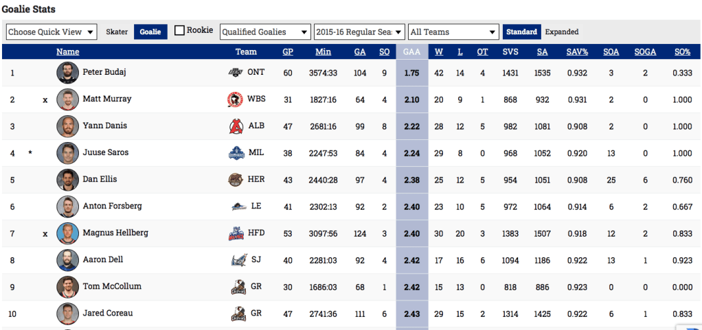 Top scorer Brian O’Neil made his NHL debut in the 2016 season with the New Jersey Devils. He played 22 games, recorded 3 assists and was a minus three. He also played 42 games with the Devils AHL team that season, and scored 32 points. O’Neil went to the KHL the next season and has not played in North American since. Andy Miele, the second leading scorer in the AHL in 2015, has not played in the NHL since the 2014 season with the Arizona Coyotes. Spread over three seasons, Miele has played 15 NHL games and earned just two assists. Since the beginning of the 2017-2018 season, Miele has played in Sweden, and the KHL, as well as one season in the AHL. Jordan Weale and Johnathan Marchessault are the only two players in the top 10 scorers that season who have played more than 60 games in a single NHL since then. The rest of the top 10 have either remained mostly in the NHL or gone to play in Europe. This shows that despite being the NHL’s main development league, success in the AHL does not correlate with sustained success in the NHL. In fact, none of the AHL’s top 10 scorers from 2015 are with the same organization this year. Furthermore, none of Manchester’s five top scorers from 2015 are still in the Kings organization today. Likewise, none of the top five Utica scorers from 2015 are with the Canucks organization today and none of the Griffins five top scorers are with the Red Wings organization in 2021. Now I think we should look at the AHL’s goalies in 2015.
