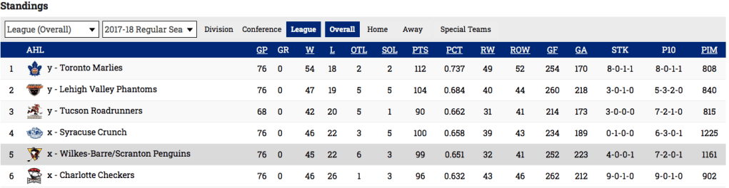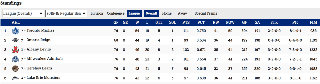 The 2016 AHL season ended with the Toronto Marlies as the best regular season team, and the Lake Erie Monsters sweeping the Hershey Bears in the Calder Cup finals. The Marlies parent club, the Maple Leafs, have not been able to win a playoff round since 2004. The Monsters parent club, the Columbus Blue Jackets, have made the playoffs four times since 2016 but have never been out of the second round. The Albany Devils had a good year in 2016, but the New Jersey Devils have only made the playoffs once since 2016, a first round exit courtesy of the Lightning. The Milwaukee Admirals parent club, the Nashville Predators, have made the payoffs every year since 2016, but never gotten out of the second round. As mentioned earlier, the Hershey Bears parent club, the Washington Capitals, won the 2018 Stanley Cup and have been a constant presence in the playoffs. Also, the Ontario Reign had relocated from Manchester and remained as the LA Kings farm team. The Kings have made the playoffs once since 2016 but were eliminated in the first round.
