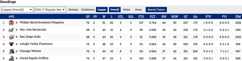 The 2017 Calder Cup was won by the Red Wings affiliate Grand Rapids Griffins when they defeated the Tampa Bay Lightning affiliate Syracuse Crunch in the finals. The best team in the regular season was Wilkes-Barre/Scranton Penguins. The Sharks affiliate San Jose Barracuda, Ducks affiliate San Diego Gulls, Flyers affiliate Lehigh Valley Phantoms and the then Blues affiliate Chicago Wolves were some of the other best teams in the AHL that year. Since this 2017 AHL championship, the Red Wings have not made the playoffs. The Tampa Bay Lightning however have won the Stanley Cup twice since their AHL team went to the Calder Cup finals in 2017. The Penguins won the Stanley Cup in 2017 while their AHL team was one of the best in the league, but have won only one playoff round since then. The Sharks were eliminated in the second round of the 2018 playoffs and made the conference finals in 2019. However they haven’t made the playoffs in either of the last two years. The Ducks have made the playoff once, but haven’t won a playoff series since the Gulls were one of the AHL’s best teams in 2017. The Flyers have been to the playoffs twice since 2017 and made the third round in the 2020 bubble. The 2017 Chicago Wolves were affiliated with the St. Louis Blues, who have won the Stanley Cup and made three playoff appearances since 2017. The best AHL teams from 2017 have had a good deal of success the last few years in the NHL, including the last three Stanley Cup Champions.