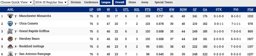 As Devils fans, looking at the current NHL standings does not exactly fill us with joy; quite the opposite actually. Yet we can look down to the AHL and see that our minor league team is off to a historically good start. The Utica Comets, the Devil’s AHL affiliate, started this season with a 13 game win streak, an AHL record to start a season. They have continued to roll since then and currently sit atop the AHL with a 16-1-2 record. This is obviously a stark contrast to the big club in New Jersey, who is struggling just to be a .500 team in the NHL. This has got me thinking about whether or not having a great AHL team translates to NHL success in following years. To do this, I am going to look at the AHL’s best teams from 2015 to 2019 and see if their parent clubs have gotten any better or worse in the following years. I am also going to look at some of the top performers on those AHL teams and see what of any impact they had on the NHL team.