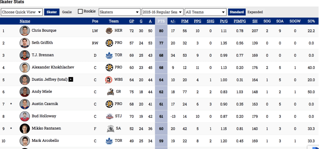 In 2015, the AHL’s best team was the affiliate of the Los Angeles Kings, the Manchester Monarchs. They went on to win the Calder Cup in 5 games over the then Vancouver Canucks affiliate, and the AHL’s second best team, the Utica Comets. Since this AHL championship, the Kings have made the playoffs just once, a first round exit in 2018. The Canucks have not been much better, making the playoffs just once, a third round exit in the 2020 playoff bubble, since having the second best team in the AHL. Of those top six AHL teams from 2015, the 4th place Hershey Bears parent club, the Washington Capitals, have been the most successful, making the playoffs every year and winning the Stanley Cup in 2018. The Grand Rapids Griffins were, and still are, affiliated with the Detroit Red Wings who have had one playoff birth, a first round exit in 2016, since this 2015 season. the Rockford Ice Dogs were, and still are, property of the Chicago Blackhawks, who have been to the playoffs twice since 2015, but did not get past the second round either time. The San Antonio Rampage of 2015 were affiliated with the Colorado Avalanche, who have been to the playoffs four times since 2015, including a trip to the third round in 2020. Now lets look at some of the top scorers from the 2015 AHL season.