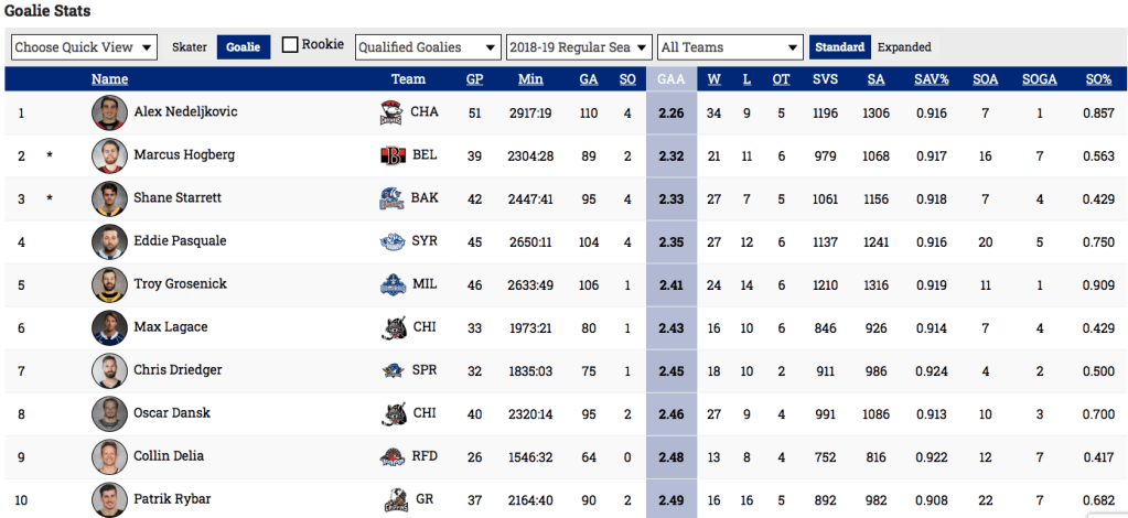 The top scorer in the AHL in 2017 was Kenny Agostino, who has played 86 career NHL games spread over six seasons and currently plays in the KHL. He was not a part of the Blues 2019 Stanley Cup championship. The second most prolific scorer in the 2017 AHL, Chris Terry, has not played in the NHL since the 2017 season, when he played 14 games with Montreal. He has spent the last five seasons in the AHL and KHL. Chris Mueller has not played in the NHL since 2015. Wade Megan has played only 15 NHL games since 2017, spending most of his time playing in the AHL. Of the top 10 AHL scorers from 2017, none of them are still with the same organization and none have become impact players in the NHL. So even though the AHL’s best organizations from 2017 have had championship level success since then, many of the top players have not. Of the top five scorers on the Calder Cup champion Griffins, Eric Tangradi is the only one with the Red Wings organization today and he has not made an impact in the NHL since 2017. The 2017 Calder Cup finalist Syracuse Crunch are a little different. One of their top scorers, Yanni Gourde, went on to be a big contributor to the Tampa Bay Lightning winning the Stanley Cup in 2020 and 2021. However, none of the Crunch’s other top five scorers from 2017 have become NHL regulars since 2017. Of the top five scorers on the 2017 AHL Penguins, only two have seen regular playing time in the NHL. Oskar Sundqvist has played mostly for the Blues and Dominik Simon has been in the bottom six for Pittsburgh. Now let’s take a look at the top goalies from the 2017 AHL season.
