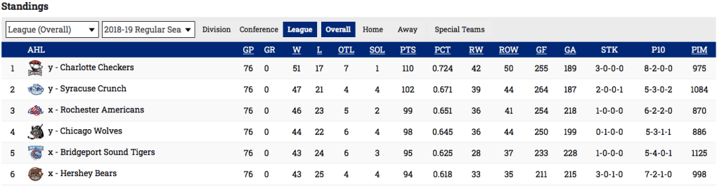 Lastly, let’s look at the AHL in 2019. The Calder Cup was won by the Charlotte Checkers when they defeated the Chicago Wolves in the finals. The Checkers parent club, the Carolina Hurricanes, are currently one the best teams in the NHL and have been to the playoffs in each of the last three seasons. The Wolves parent club in 2019 was the Golden Knights, who have been to the playoffs in each of the last four seasons. The Rochester Americans parent club, the Buffalo Sabres, are currently on the longest active playoff drought in the NHL and it looks like that will continue this season. The Sound Tigers parent club, the New York Islanders, have been to the playoffs in each of the last three seasons but are currently struggling mightily this season.