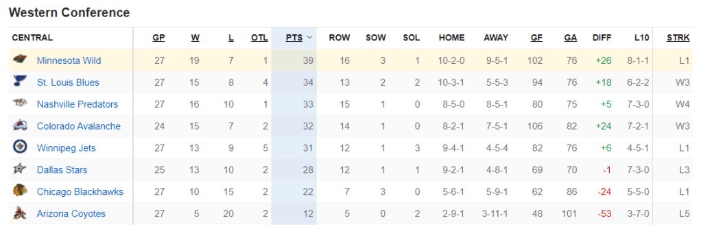However, once you get past the Wild, the Blues, Predators, Avalanche and Jets are all within three points of each other. While Colorado is currently in fourth-place, they’ve also played three less games than the Wild to this point in the season, which even if they win 2 of those 3 games, it would certainly tighten up the standings in the Central Division. Four of the Wild’s eight losses have been by only one goal and each of those games were on the road – at Vegas, Tampa Bay, Florida and Los Angeles.