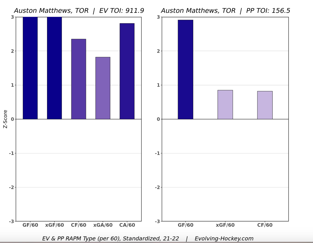 He leads all NHL skaters in goals, even-strength goals, wins above replacement and goals above replacement. His defensive play has been outstanding, Selke level even. He is scoring goals at a pace similar to prime Alex Ovechkin and has been as good defensively as Patrice Bergeron. There is no one more complete in the NHL right now than Matthews.