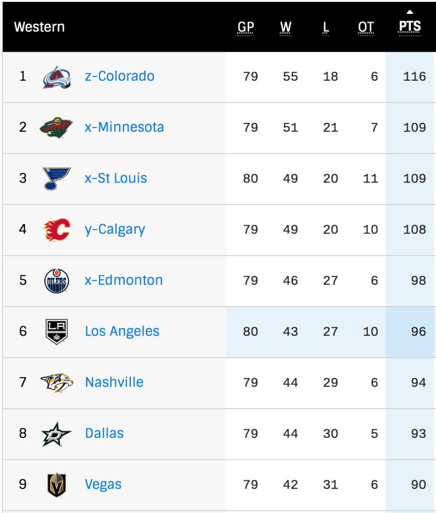 Three games left and three playoff spots remain in the Western Conference. The Eastern Conference playoffs have been set but we await to see what happens in the West. LA, Nashville, Dallas, and Vegas are the final four teams looking to get in. The Kings sit at 96 points and have two games remaining. With six points ahead of Vegas its looking like LA will secure the third seed in the Pacific. Vegas has to win out and LA has to lose their last two games in order for things to change in the Pacific. This leaves the two wildcard spots where Nashville and Dallas sit at 94 and 93 points; each have three games left to play. Will Vegas miss the playoffs for the first time in franchise history?