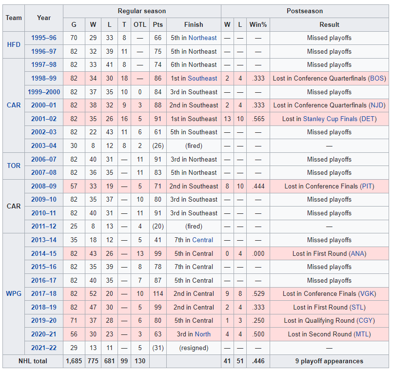 He made a Stanley Cup Finals appearance with the Hurricanes in 2001-02 and a few Conference Finals with the Hurricanes and Jets; however, what has he really accomplished?