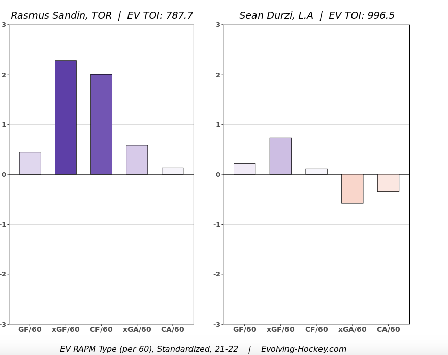 A former Leaf prospect, Sean Durzi, just re-signed with the Kings for two years at $1.7M AAV, and many Leaf fans are using this as a comparable to Sandin. Many are also implying that Sandin hasn’t impressed as much as Durzi. Durzi is a fine young defenceman and looks good value for money on that deal, but the idea that Sandin is not as good as Durzi or doesn’t deserve something similar just isn’t accurate.