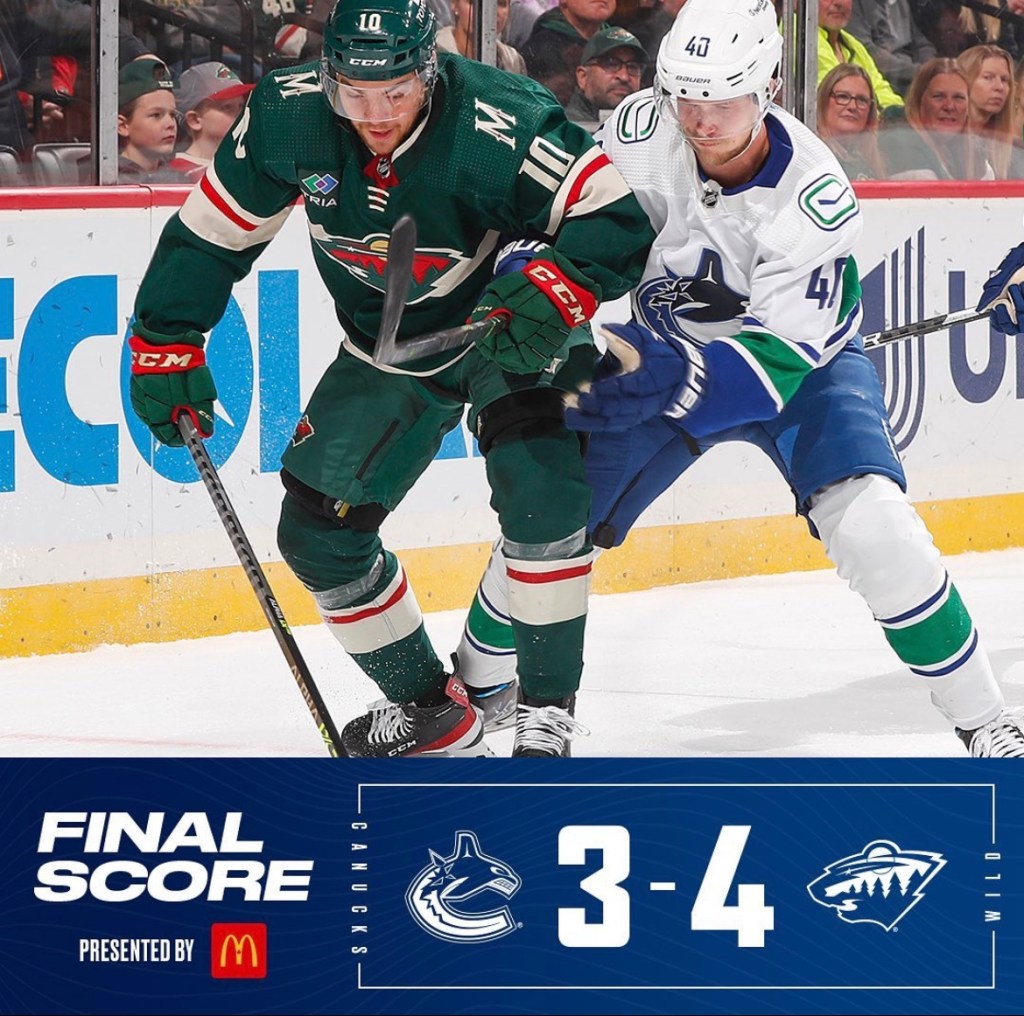They might not have blown a two goal lead, but the Canucks squander three separate one goal leads to fall to Minnesota in overtime. The Canucks went down 1-0 in the first before goals from Bo Horvat and Nils Aman gave them the lead. Sam Steel scored for the Wild to tie the game up at the end of the first. Dakota Joshua had the only goal in the second, which gave the Canucks their second lead of the game. A power play goal from Mats Zuccarello tied it up in the third and Kirill Kaprizov scored the game winning goal for the Wild just over three minutes into overtime. The Canucks struggled on special teams going 0 for 2 on the power play and allowing 1 power play goal on 3 Minnesota chances. The Canucks were outshot 27 to 26 and outhit 21 to 12 in the contest. With this loss, the Canucks have gone winless in their season opening five game road trip. It is a horrendous start for a team doing all it can to try and make a return to the postseason.