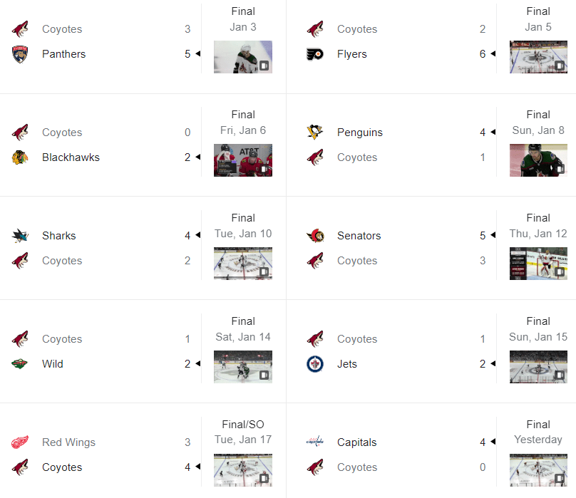 During the recent ten-game stretch, the Coyotes have averaged 1.7 goals for and 3.7 goals allowed; this includes two shutout losses. Although one of the shutout losses was against Ovechkin and the Washington Capitals, the other loss came against the underwhelming Chicago Blackhawks. Currently, the league’s goals-against average is at approximately 2.95. The Yotes’ have only allowed less than three goals in three of the ten games.