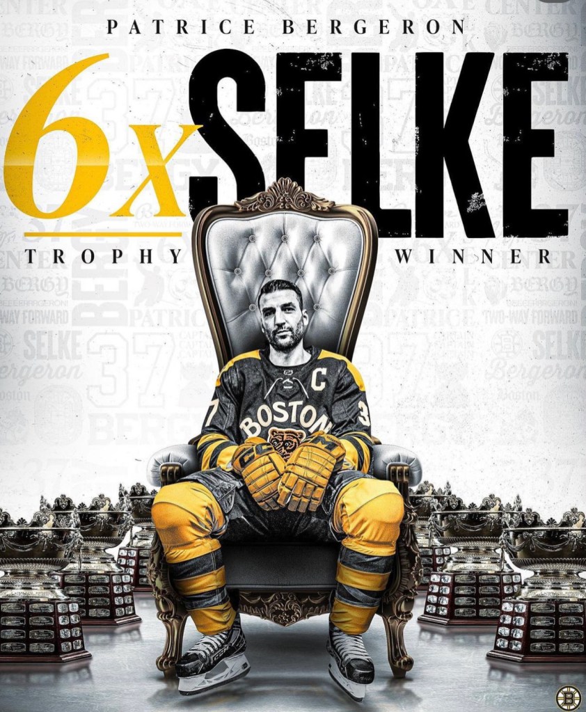 The highlight of the evening? It wasn’t seeing HC Jim Montgomery take home the Jack Adams and deliver a heartfelt speech. It wasn’t seeing Linus Ullmark snag his first Vezina and dodge Biz’ attempt at a weird stand-in goalie hug. It also wasn’t seeing David Pastrnak awkwardly deal with some yahoo’s kid that somehow got on the broadcast. The highlight of the entire show was Patrice Bergeron winning his NHL record 6th Frank J. Selke Award. Yup, you read that right Chumley. No one else in the history of hockey has won this 5x, but your boy Bergy has 6!