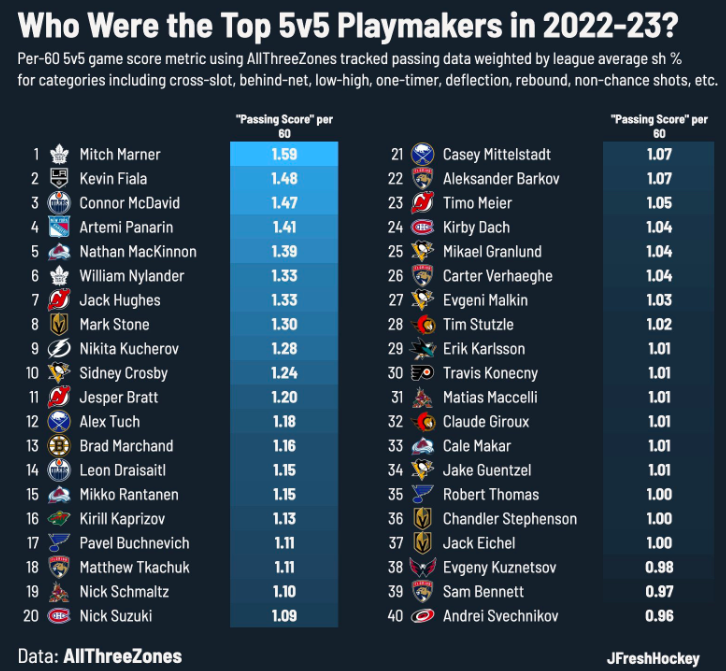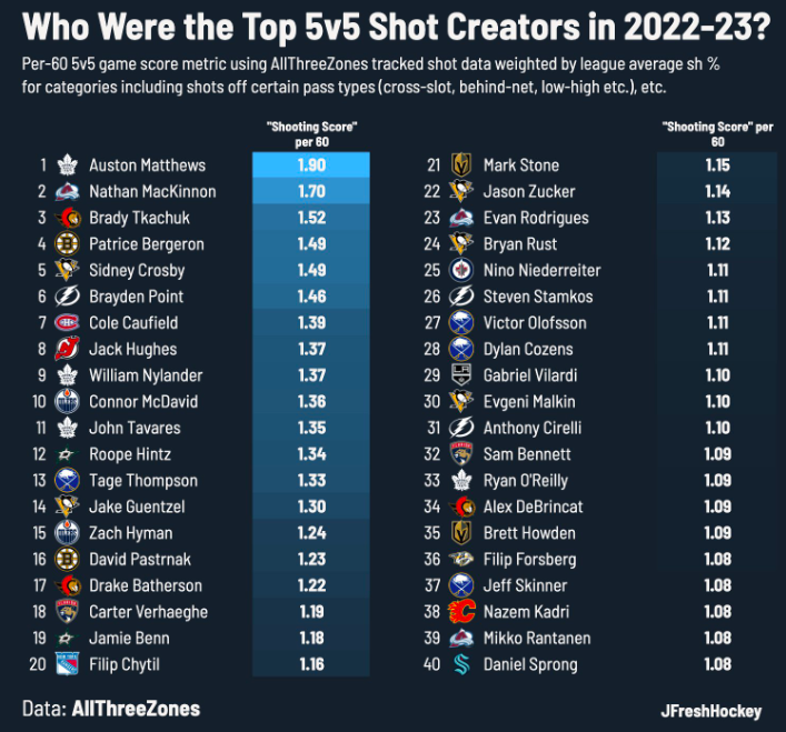 Digging deeper, we can look at these lists from JFreshHockey and AllThreeZones data showing Nylander’s involvement last season (9th and 6th). His ability to be a dual threat is unmatched on this Leaf roster, and in fact, it’s matched only by a few elite players in the entire NHL. The only players in the top 10 of both of these lists are Connor McDavid, Sidney Crosby, Nathan MacKinnon, Jack Hughes and William Nylander. Decent company.