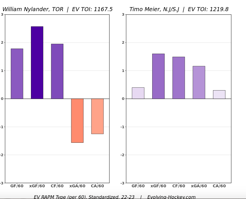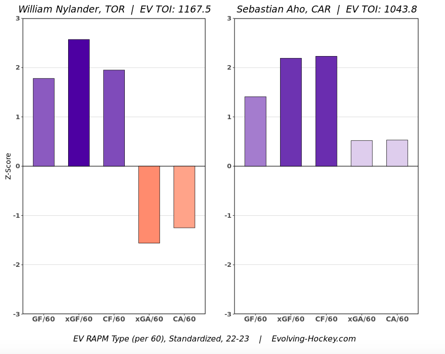 These charts help show Aho and Meier’s overall game is a bit more refined and where the Swede lacks. Meier and Aho are good comparisons because Nylander fits directly in the middle of their two contracts. Nylander is a better player than Timo Meier and worth more. They have similar career stats and score at a similar clip, but Nylander’s capacity to carry the puck and create for his teammates is a level above Meier’s. On the other hand, Aho plays a more valuable position than Nylander, has more goals and points in his career in a similar amount of games, and is a more complete player. Offensively, Aho isn’t as dynamic as the Leafs’ forward, but his other attributes make up for that.
