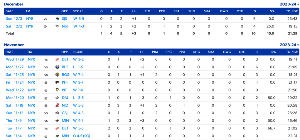 At the moment Chytil was injured, Lafreniere had scored just 4 times in 10 games, Following the game on November 2nd, and once put on a wing with Vincent Trocheck, Lafreniere has scored 4 more times and assisted on 7 other goals, accounting for 11 points in 13 games – almost a point per game clip. Playing with Panarin definitely helps put the puck in the back of the net but you can see the confidence starting to shine in Lafreniere game. His 33 shots in those 13 games are sitting at a 2.5 shots a game clip since Trocheck has been put in the middle. In comparison, Lafrienere was averaging just 1.3 shots per game playing with Chytil. Panarin continues to dazzle and Lafreniere continues to play like he belongs in the top 6.