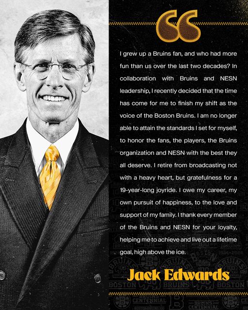 It’s come to an end. The Jack Edwards experience is packing it up and moving on. From “high above the ice” on the 9th floor of the TD Garden; the voice of your Boston Bruins for the last 19 years (19 YEARS!!), is finishing out this season’s playoff run and saying goodbye to a generation of Black and Gold Faithful who’ve never known another voice as their soundtrack for Bruins’ TV coverage. And Martha… he had quite the run.