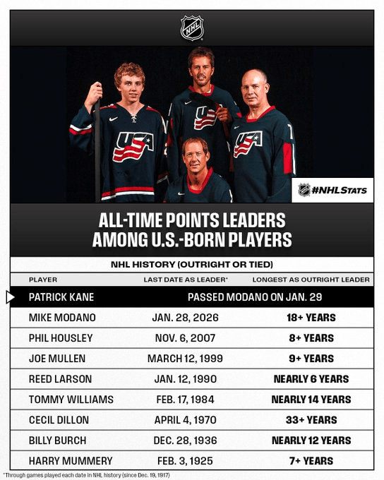 With that assist from Kaner he becomes the all time scoring leader among U.S. born players passing Mike Modano. Really wish he was invited to the Olympics instead old ass Brock Nelson.