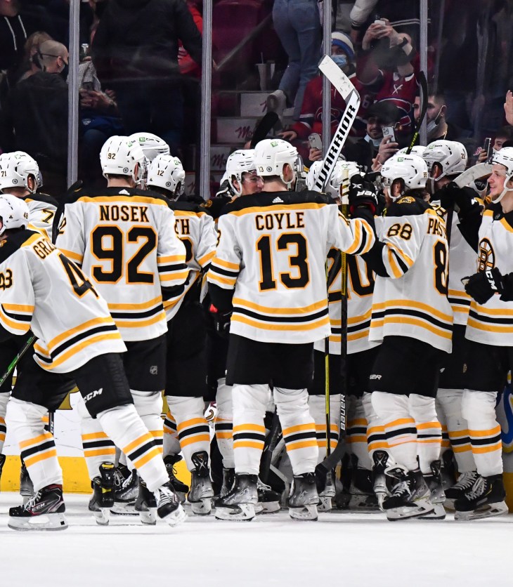 The Bruins dump the Canadiens in OT to draw even with the Leafs in the standings.