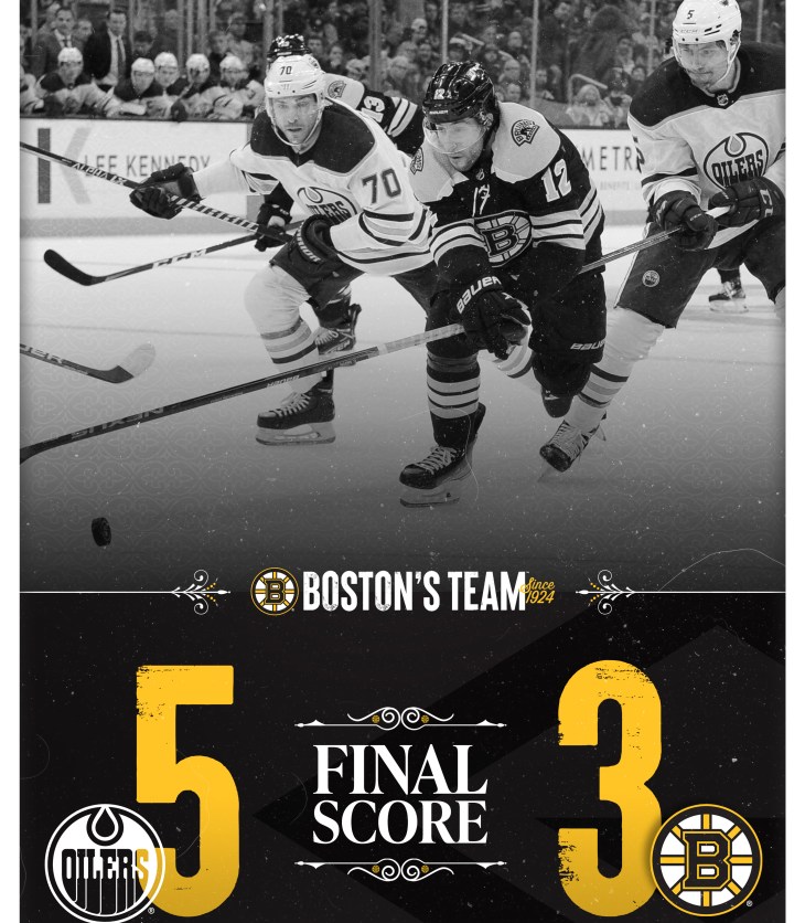 The Boston Bruins give one away to the Edmonton Oilers for their first loss of the season at TD Garden.