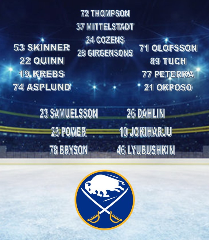 Following Sabres practice today, Don Granato indicated that the lines that were on the ice together today are likely to be the lines Sabres fans will see on opening night. The lines were reported as Asplund and Okposo centered by Girgensons; Skinner and Olofsson with Thompson; Tuch and Quinn with Mittlestadt; and Krebs and Peterka with Cozens. The odd line out would appear to be Bjork, Sheahan and Hinostroza.
